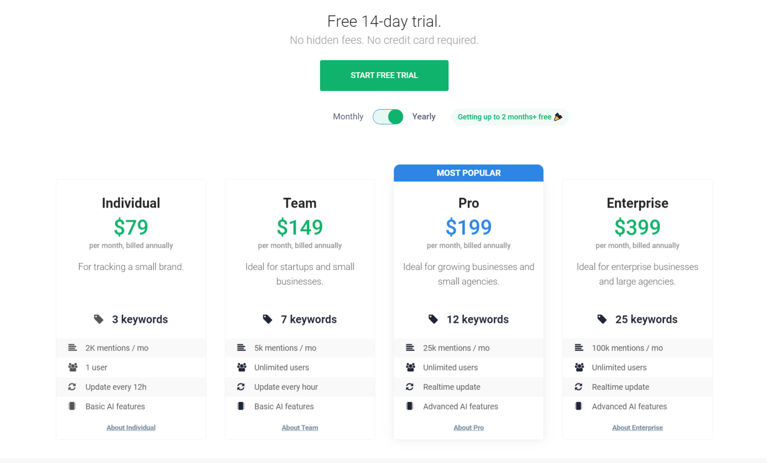 Brand24 提供了四种定价档,为不同的业务需求量身定制。这些定价计划包含了高质量的数据,旨在让社交媒体监测对每个人都变得可达和有价值。如果需要额外的功能,用户可以联系销售团队讨论个性化计划。此外,他们提供了一个 14 天的免费试用,无需信用卡即可注册。这四个定价档分别为个人版、团队版、专业版和企业版,每个定价档都有不同的用户数、关键词数量、提及次数和更新频率,以及不同的数据来源和 AI 功能。选择年费付款的用户还可以获得长达两个月的免费使用期。总的来说,Brand24 致力于提供多样化且价格实惠的社交媒体监测解决方案,以满足不同用户的需求。