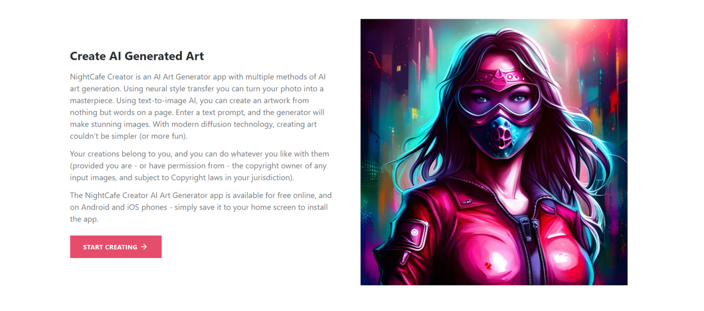 NightCafe最初是作为一个基于进行图片风格转换的网站而创建的。随着人工智能技术的进步和用户需求的增长,NightCafe已经发展成为一个功能全面的AI艺术生成平台,拥有数百万用户和数千万的创作作品。它利用先进的AI算法,可以帮助用户快速生成各种风格的艺术作品,包括但不限于绘画、插图和数字艺术等。