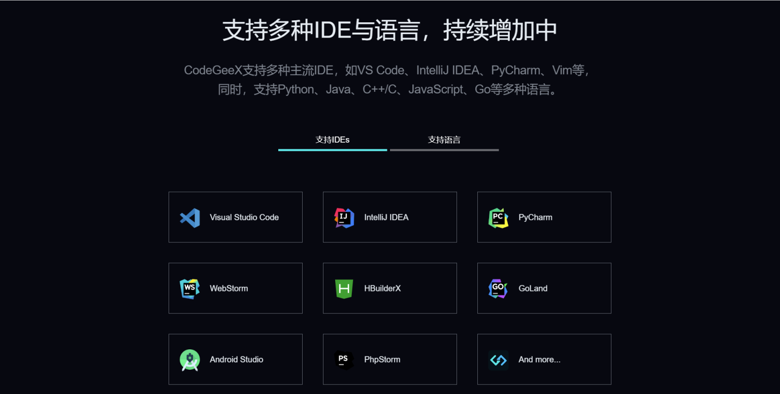 CodeGeeX 支持超过 20 种编程语言,包括 Python、Java、C++、JavaScript 和 Go。它还可以作为插件安装到流行的 IDE 中,如 VS Code、IntelliJ IDEA 和 PyCharm。