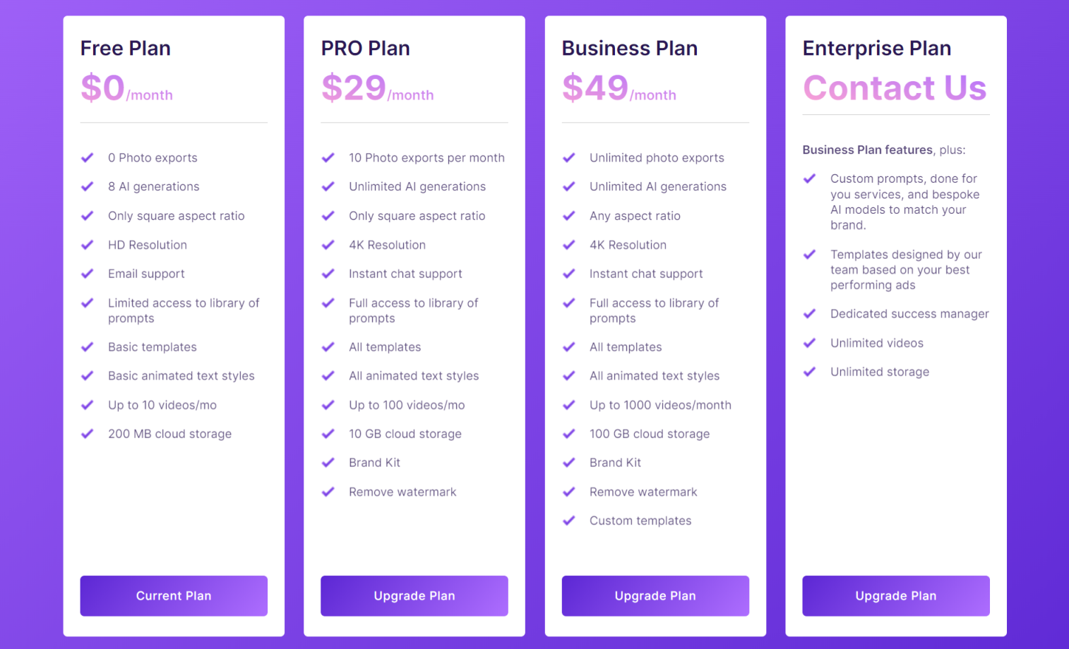 CreatorKit 提供多种灵活的定价方案,以满足不同用户的需求。免费计划包括有限的功能,适合初次尝试的用户。PRO 计划每月 29 美元,提供更多的照片导出、无限次的 AI 生成、高清分辨率和即时聊天支持。Business 计划每月 49 美元,拥有更大的云存储空间、自定义模板、品牌工具包等高级功能。企业计划为定制需求,用户可联系团队获取更多定制服务,包括定制提示、由团队设计的模板、专属成功经理等。CreatorKit 的定价灵活多样,让用户可以根据其业务规模和需求选择最适合的方案,提供高性能的 AI 图像和视频创作服务,节省时间和成本。