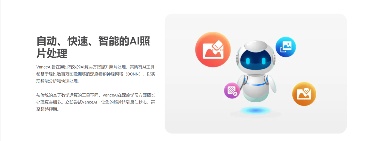 VanceAI旨在通过有效的AI解决方案提升照片处理。其所有AI工具都基于经过数百万图像训练的深度卷积神经网络(DCNN),以实现智能分析和快速处理。