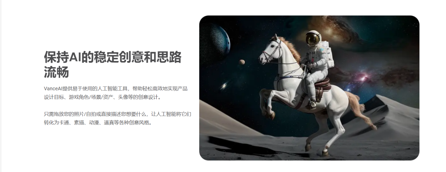 VanceAI提供易于使用的人工智能工具,帮助轻松高效地实现产品设计目标、游戏角色/场景/资产、头像等的创意设计。