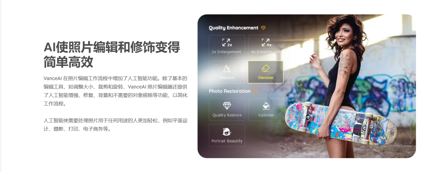1. AI图像增强:Vance AI使用人工智能技术来提升图像的细节,改善图片的整体质量。这对于需要提高照片清晰度和视觉效果的用户来说非常有用。