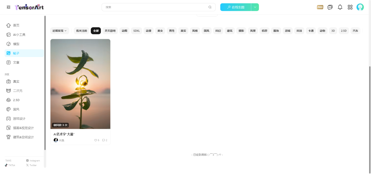 在线生成图像:用户可以通过TusiArt平台,利用预设的图像生成模型,在线生成各种风格的图片。无需下载任何专业软件,只需在网页上简单操作即可实现,大大降低了图像创作的门槛。