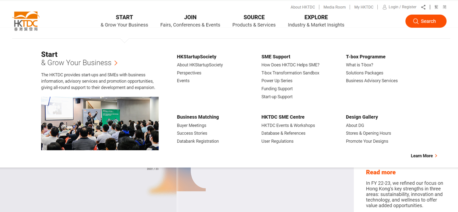 此外,香港贸发局每年举办超过100项针对中小企业需求的推广活动,包括展览、研讨会、工作坊和论坛,吸引超过22,000家香港中小企业参与。