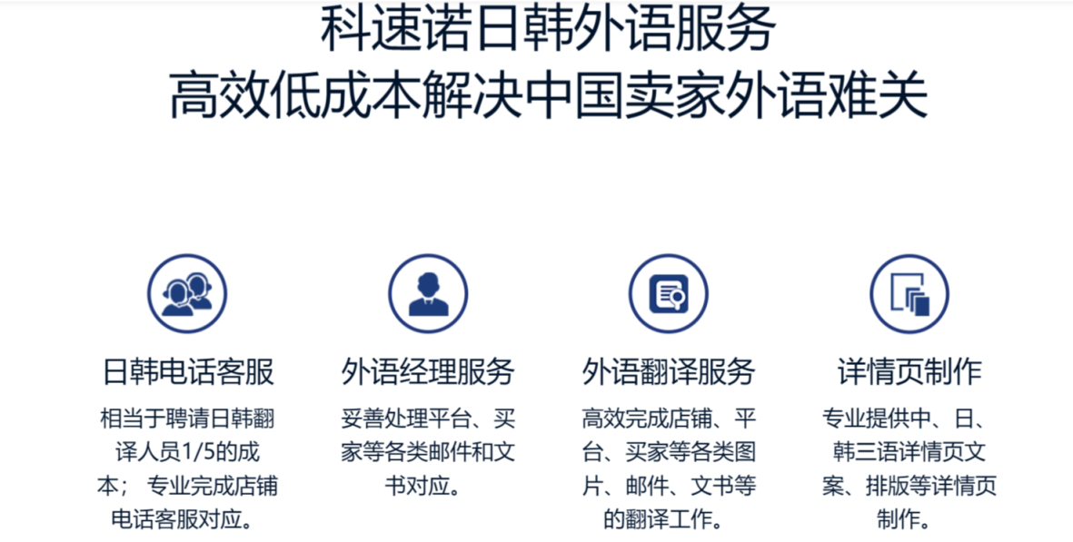 科速诺专注日韩跨境14年,作为一站式跨境电商综合服务商,凭借多年日韩跨境经验,综合近千家店铺运营需求 为跨境卖家提供全面、深层、优质、实惠的服务与支援。主要提供本土店开店、店铺运营、外语服务、学习&ECC、店铺风控、ERP系统、物流&海外仓、代申请、大客户定制等功能服务。