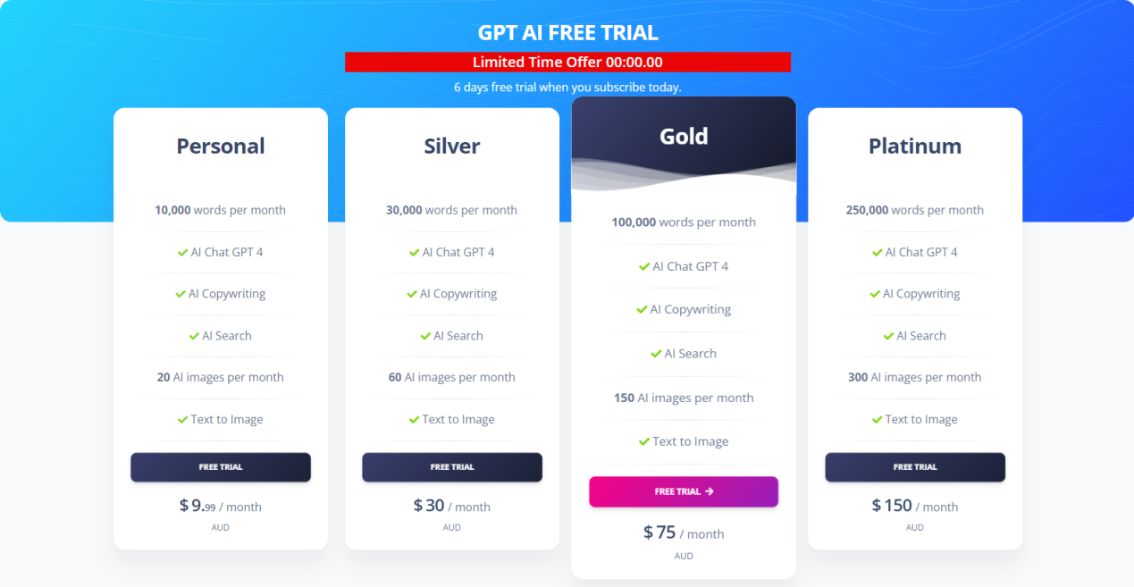 WilfieGPT 的免费计划为用户提供了访问 10,000 个文案文字的机会,每月可处理最多 100 个订单,并包含简单的数据洞察和客户终身价值报告。这一免费计划使用户能够充分体验 WilfieGPT 的基本功能,为其提供高效的文案撰写支持和业务数据洞察。WilfieGPT 还提供了四种付费计划,包括:个人、白银、黄金和白金。