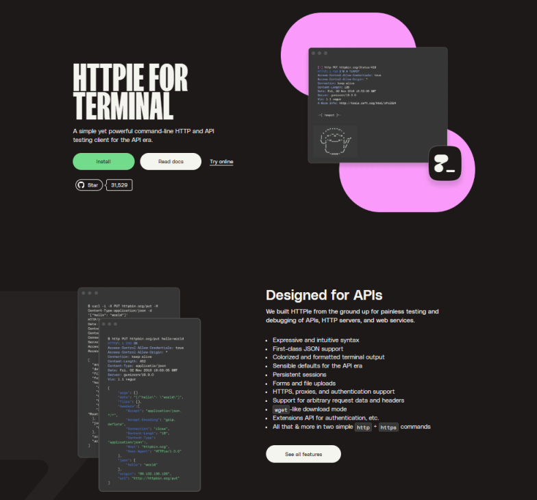 用于终端的 HTTPie,它的目标是使CLI与web服务的交互尽可能人性化。HTTPie是用Python编写的,可以通过pip安装。它提供了一个简单易用的命令行界面来发送请求,上传文件,接收响应等,使得与web服务的交互变得简单直观。