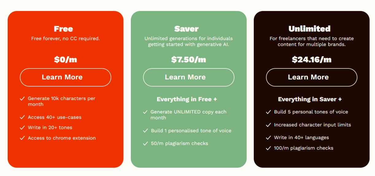 2.Saver(节省方案):每月$7.50,适合需要为多个品牌创建内容的自由职业者,提供无限生成字符,增加字符输入限制,以及每月50次抄袭检查。