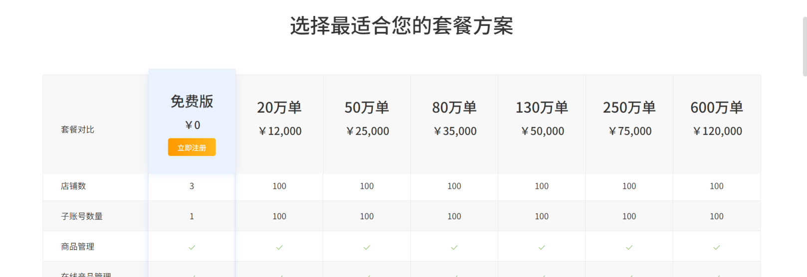 免费版: 适合小规模店铺,免费使用,支持 3 个店铺和 1 个子账号,提供基本的产品管理、订单同步、利润查看等功能。