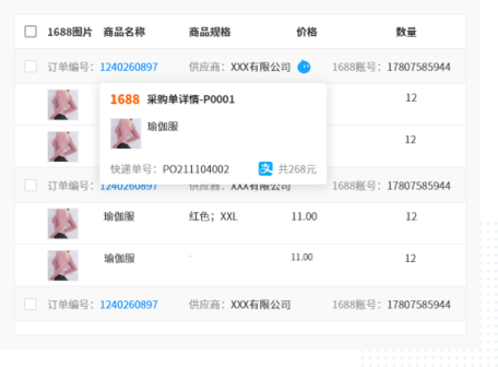 1688 采购管理: 高效协同采购、仓库、财务部门,支持多种支付方式,自动识别运单号,及时跟进在途包裹,完美衔接仓库收货流程,避免运营抢占库存。