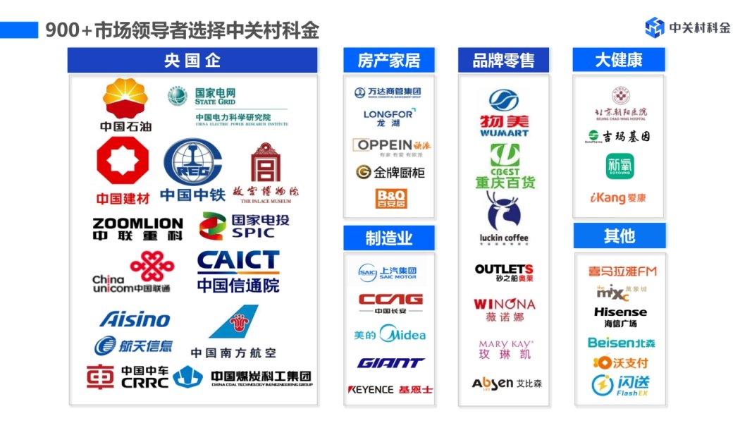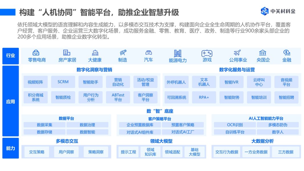 凭借领先的AI技术实力、系统的解决方案能力、深度的行业服务经验,中关村科金已服务900余家头部企业,将AI创新广泛应用于金融、政务、零售、医疗、制造等行业,助力企业高效赢得客户,实现数智化转型升级。累计服务了工商银行、中国银行、邮储银行、招商银行、中国人保、泰康保险集团、五矿信托、国家电网、龙湖地产、百安居、捷安特、基恩士、美的、步步高等数十家500强客户,拥有泛行业数字化经验。