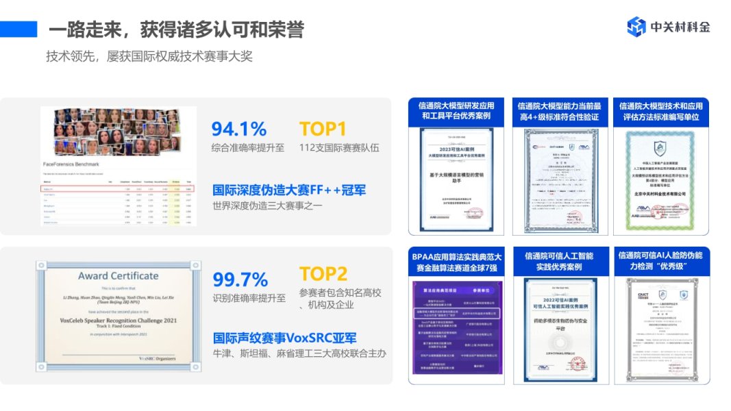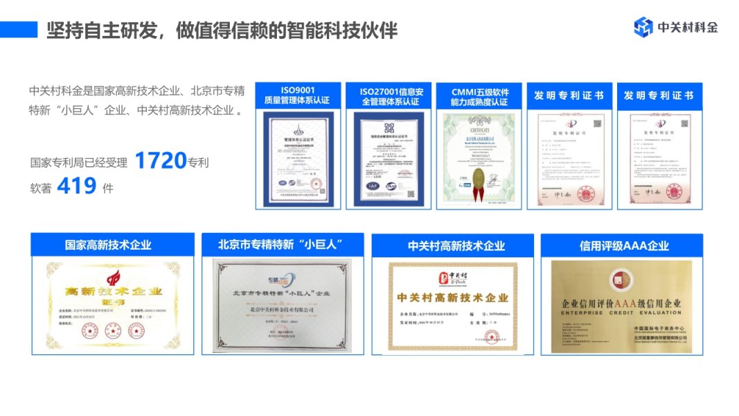 通过自主研发的领域大模型、大数据分析、多模态交互三大核心技术,中关村科金构建了一个坚实的技术底座—生成式得助对话引擎,并基于此打造数字化洞察与营销、数字化服务与运营、数“智”底座三大矩阵,全面升级云呼叫中心、智能客服、智能外呼、质检陪练、智能音视频等产品,实现高效率、低成本、规模化的AI创新应用。累计申请受理292项专利,获得298项软著及CMMI5国际认证。其中人脸识别、声纹识别等人工智能前沿技术领先行业,屡获国际大奖。