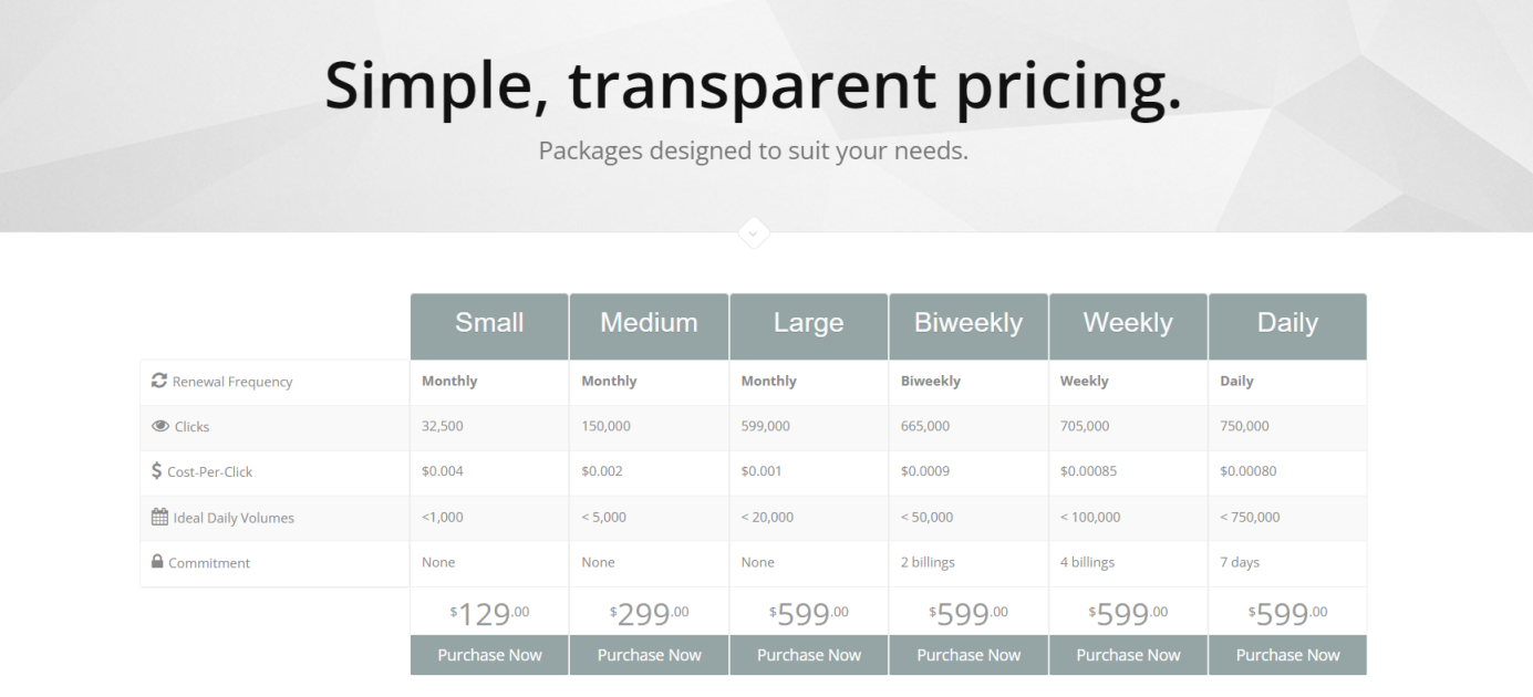 大型套餐提供599,000次点击,点击成本为$0.001。
