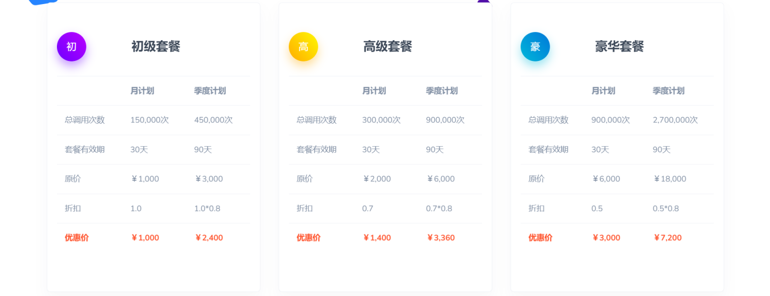 ABJUMP 为用户提供固定价格套餐,根据不同调用需求和有效期制定月度或季度计划。初级套餐提供 15 万至 45 万次的总调用次数,月计划为 1000 元,季度计划优惠价为 2400 元;高级套餐则可获得 30 万至 90 万次的调用次数,月计划为 1400 元,季度计划优惠价为 3360 元;而豪华套餐则提供 90 万至 270 万次的调用次数,月计划为 3000 元,季度计划优惠价为 7200 元。套餐除了不限制域名、广告系列和每日调用次数,还支持套餐升级,若调用次数即将用完,用户可在有效期内补差价升级更高调用次数的套餐,保持套餐有效期不变。