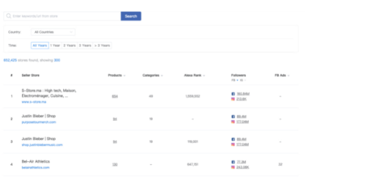 FindNiche统计了几乎全球所有的Shopify商店。在这里您可以跟踪目标国家,广告数量,Facebook页面,Alexa排名,以及你的竞争对手或顶级dropshipping商店的广告总数。想成为像他们一样的顶级店铺吗?学习模仿他们的设计!