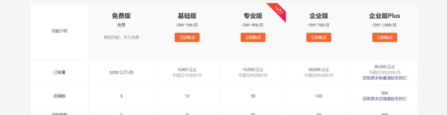 免费版:提供基础功能,永久免费,适合小型业务,订单量在 3000 以下/月,店铺数在 5 个以下,支持 2 个子账号。