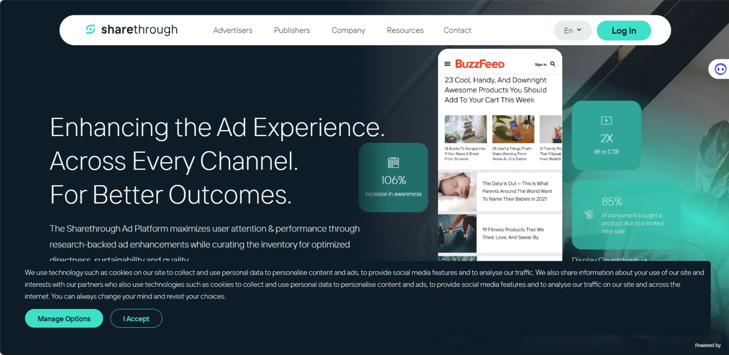 Sharethrough提供了一个内容推广平台,帮助广告主将品牌内容嵌入到网站和移动应用程序的原生广告中。他们通过与发布者合作,在用户体验不受干扰的情况下,以一种有价值的方式将品牌内容呈现给受众。