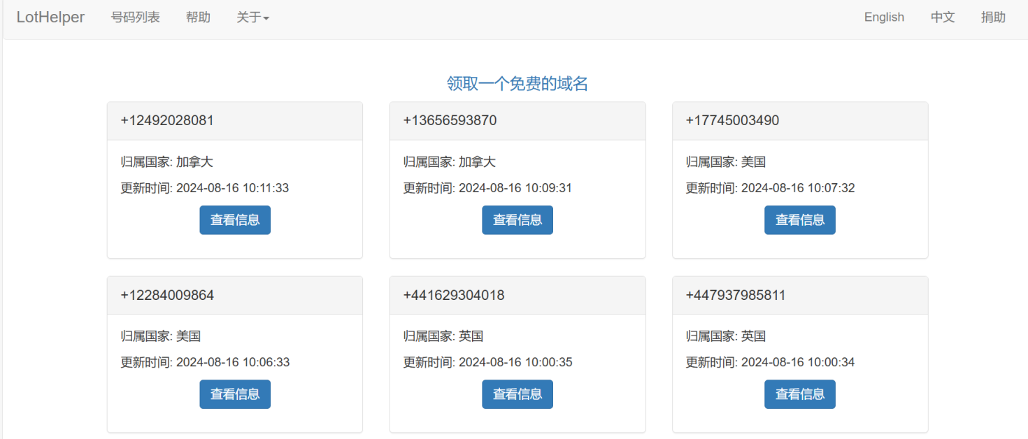 LotHelper是一个提供免费短信服务号码的平台,用户可以在该平台上获取一个临时的手机号码用于接收短信。这个服务通常用于那些需要验证手机号码但又不想暴露自己真实号码的场景,如注册某些网站或应用程序时。