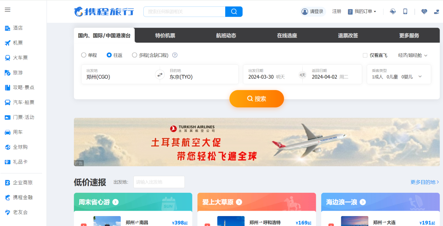 携程提供国内外航班的机票预订服务,用户可以比较不同航班的价格、时间和航空公司,选择最合适的航班。