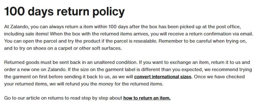 无忧退货政策:Zalando支持长达100天的无理由退货政策,并简化了退货流程。消费者无需承担退货风险,可以放心购买。