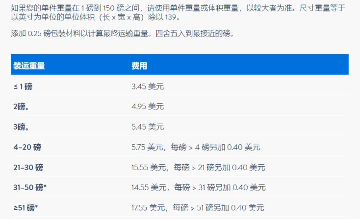 产品运费根据产品的不同尺寸而不同,尺寸越大运费越高。物品尺寸在1磅—50磅之间费用从3.45美元开始递增;50—500磅之间运费从155美元开始递增。下图为运费标准: