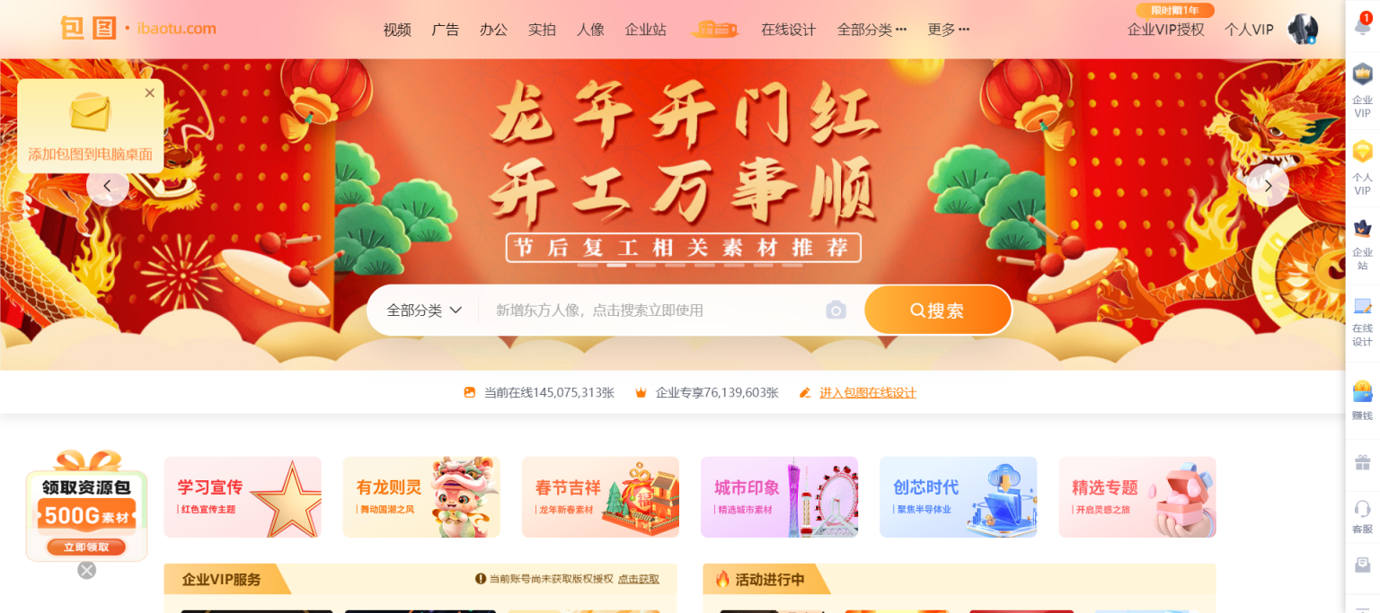 包图网是中国领先的创意内容供应平台,于2016年成立,隶属于上海包图网络科技有限公司。平台汇聚了超过30万名顶尖设计师、创意工作室以及国内外图库平台,拥有超过1.5亿份优质正版创意内容,涵盖图片、视频、音频、源文件等多种形式。截至2020年12月,注册用户已突破5亿人次,累计下载量超过10亿次。包图网建立了完善的版权备案和商用授权体系,所有素材均拥有独家版权或获得版权方授权,可用于线上传播、线下印刷、装饰装修、户外广告等多种商业用途,为企业用户提供强大的版权保障,让用户无需担心版权风险。