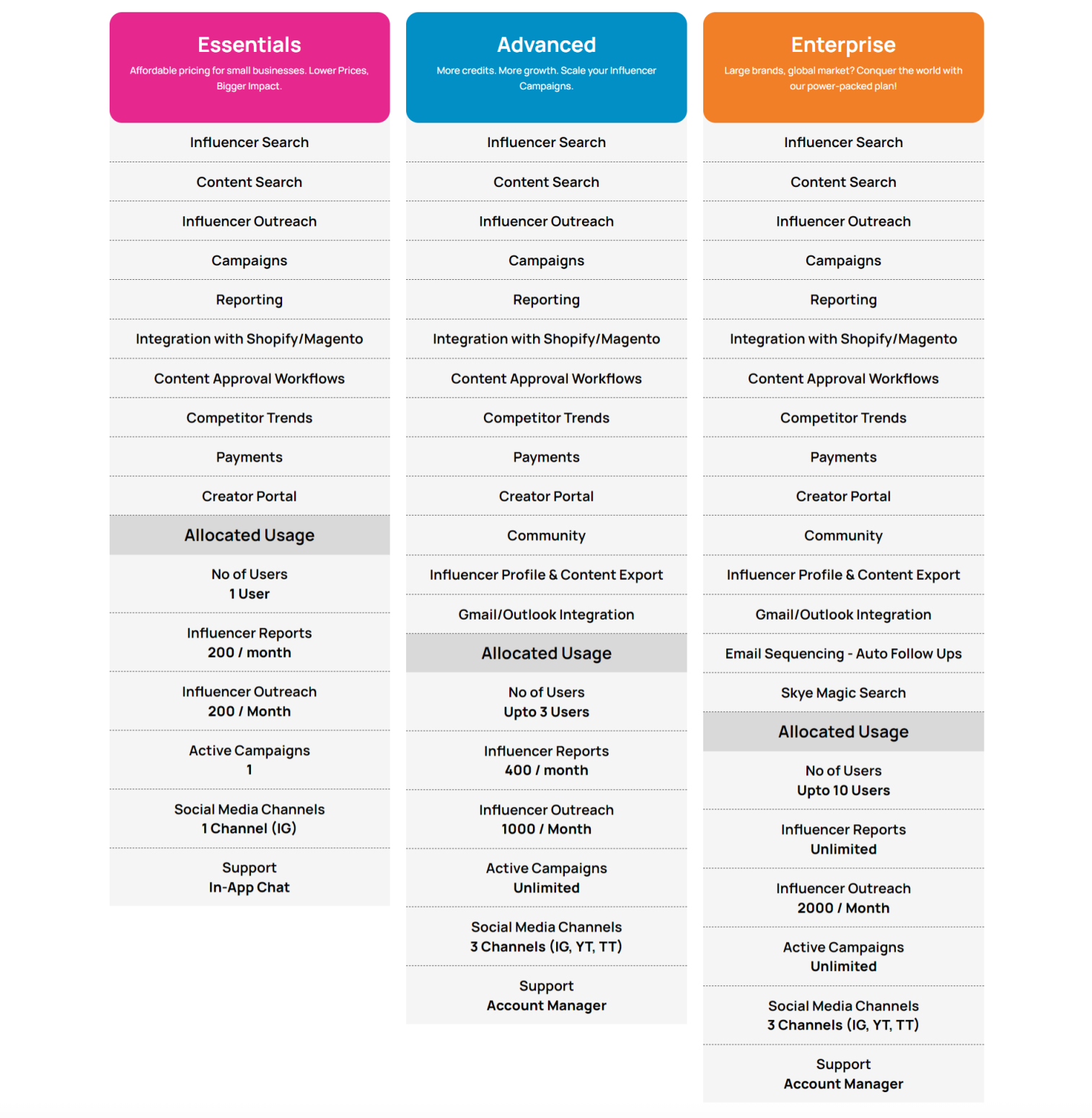 affable.ai 提供灵活的定价计划,适用于各种规模的公司,包括品牌和代理商。对于小型企业,Essentials 计划提供了经济实惠的价格,涵盖了 Influencer 搜索、内容搜索、Influencer 推广、活动、报告等多个关键功能,适合低成本、高影响的需求。对于需要更多信用额度和更大增长的企业,Advanced 计划提供了更多的信用额度,支持多达 3 个用户,覆盖了更广泛的 Influencer 推广、活动和社交媒体渠道。而对于大型品牌和全球市场的企业,Enterprise 计划则是一个强大的选择,不仅无限制地覆盖了 Influencer 报告、推广、活动和社交媒体渠道,还提供了高达 10 个用户的支持,以及更多高级功能,如自动跟进、Skyle Magic Search 等。此外,用户还可以选择不同的附加服务,如白标签、额外用户等,以满足其特定需求。affable.ai 通过不同的计划和附加服务,为企业提供了灵活的定价策略,确保满足各种规模和需求的客户。