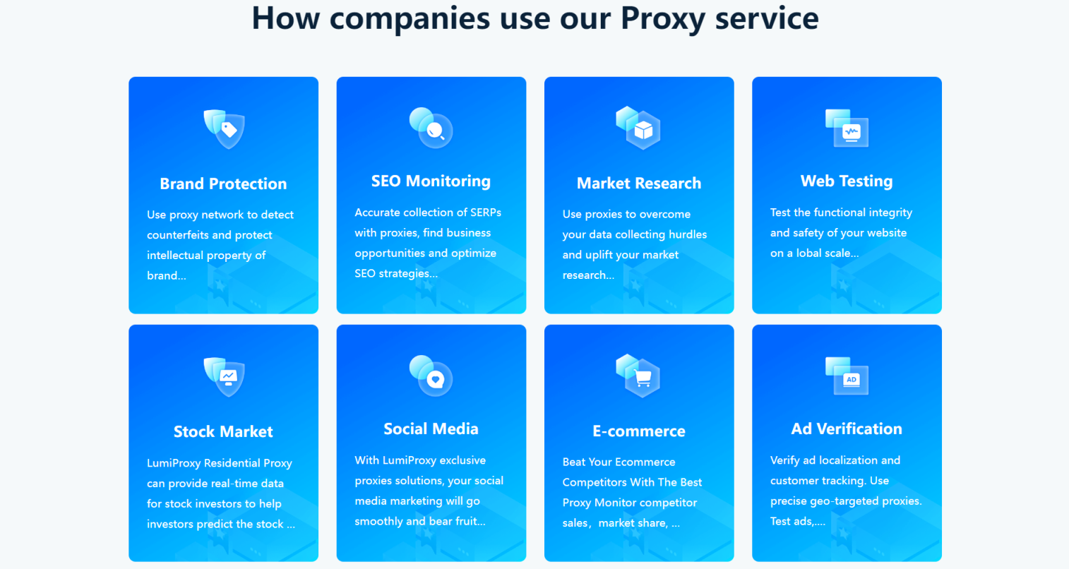 Lumiproxy 的服务适用于需要高质量代理、数据采集、地理定位和网络访问无障碍的各种行业和专业人群。