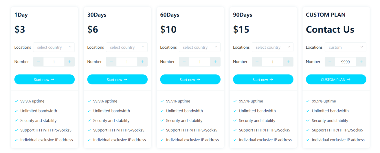 所有方案均享有 99.9% 的正常运行时间、无限带宽、HTTP/HTTPS/Socks5 支持,并提供安全稳定的服务。