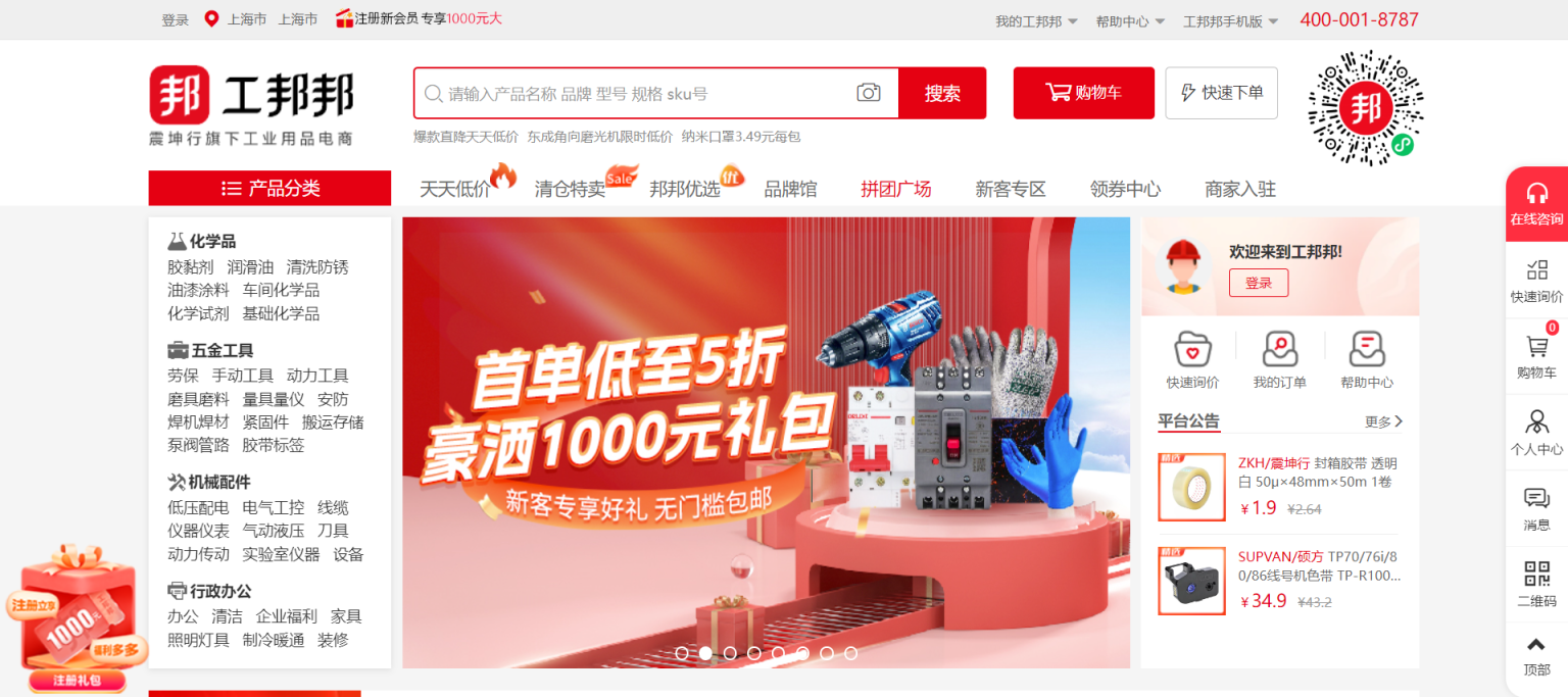 多品类现货:工邦邦致力于满足中小微企业多样化的采购需求,覆盖了 42 条产线,拥有 1700 万多个 SKU 的产品。用户可以在平台上找到涵盖了化学品、五金工具、机械配件、行政办公用品等多个品类的丰富选择,方便一站式采购。