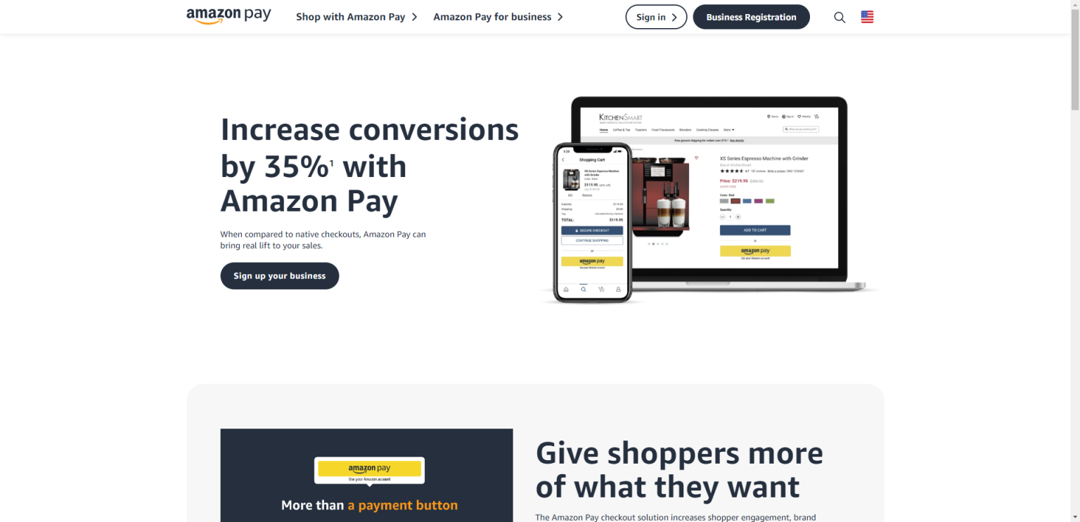 第三方卖家可以通过Amazon Payments SDK(美亚的一款支付网关)将亚马逊支付按钮添加到结账页面。通过Shopify、BigCommerce、 Magento或Zuora等亚马逊主要合作伙伴销售,也可以添加该支付方式。