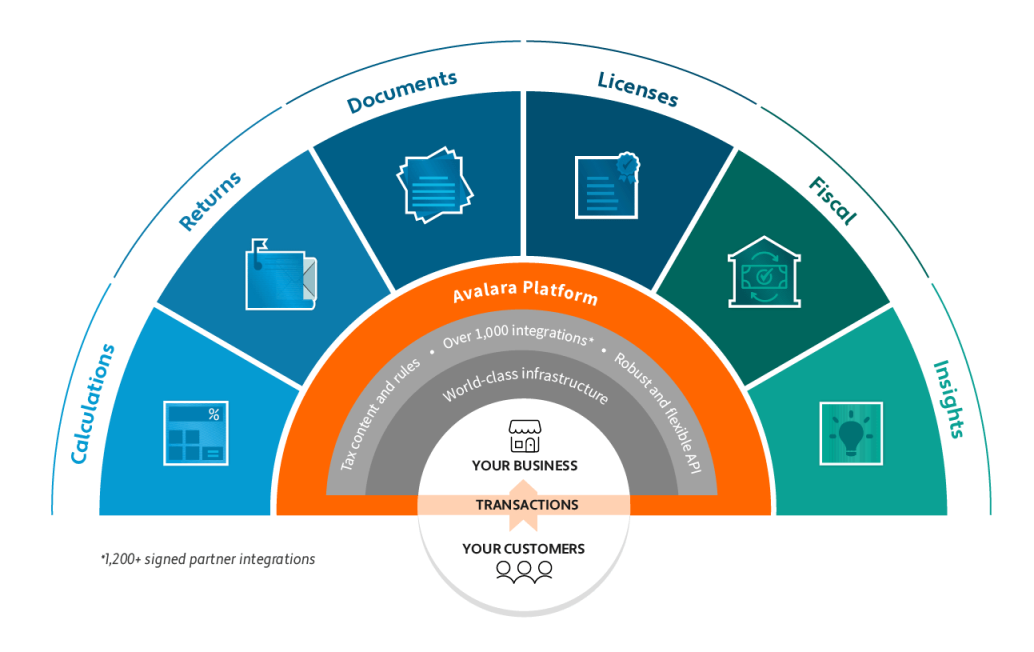 灵活可伸缩的解决方案:Avalara 平台采用可伸缩的架构,适应业务增长,支持水平扩展、数据驱动的分析和超过 1,200 个合作伙伴集成。